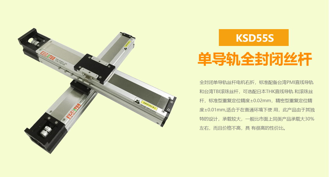 全封闭单导轨丝杆带电机座,标准配备台湾PMI直线导轨和台湾TBI滚珠丝杆,可选配日本THK直线导轨和滚珠丝杆,标准型重复定位精度±0.02mm,精密型重复定位精度±0.01mm,适合于在普通环境下使用,此产品由于其独特的设计,承载较大,一般比市面上同类产品承载大30%左右,而且价格不高,具有很高的性价比。